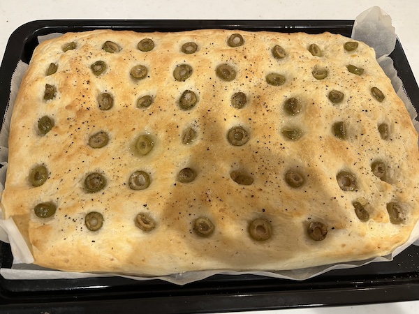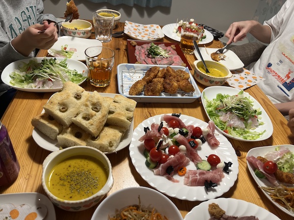 ローストビーフと鱈のカレー風味の唐揚げをメインに、カボチャのスープ、ブロッコリー、茹で卵、アボガドのサラダ、金平、鯛のカルパッチョ、ピンチョス、そして焼きたてのフォカッチャを作りました