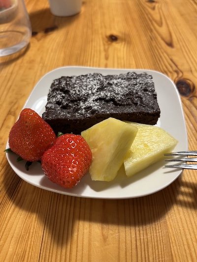 デザートは「バナナブラウニー」とフルーツでしたが、私はお腹いっぱいで持ち帰りました(笑)